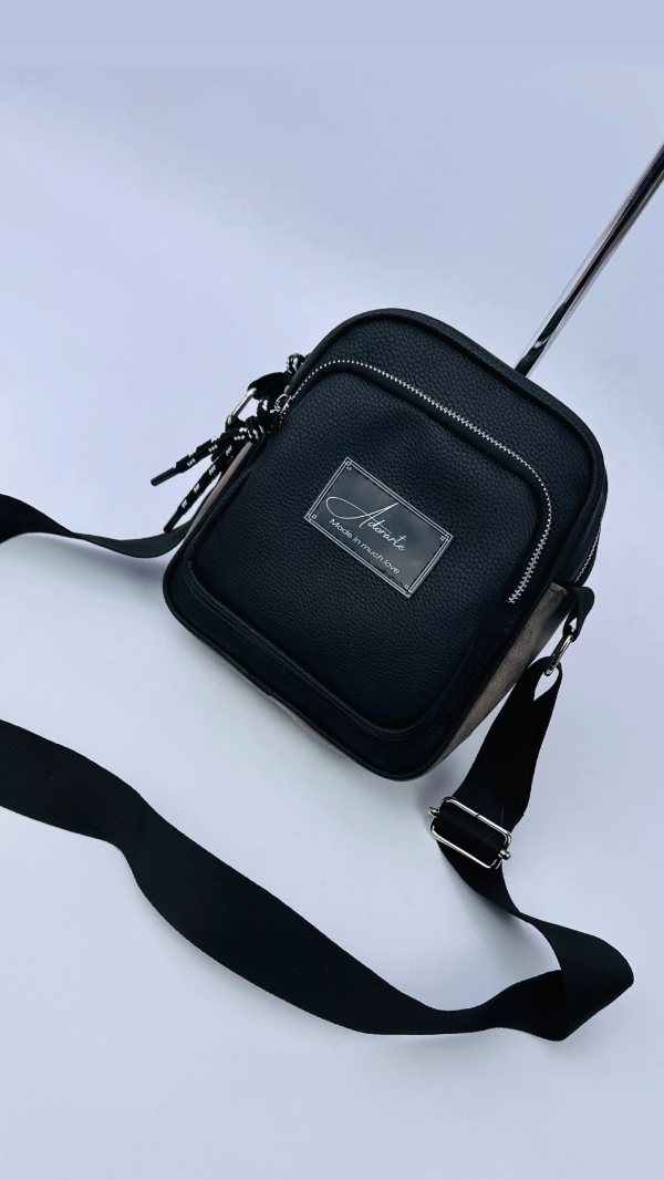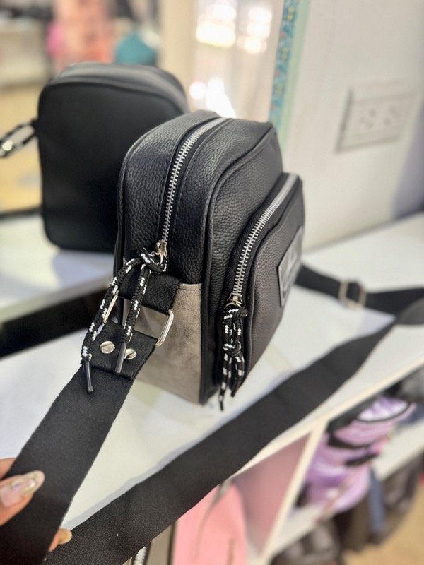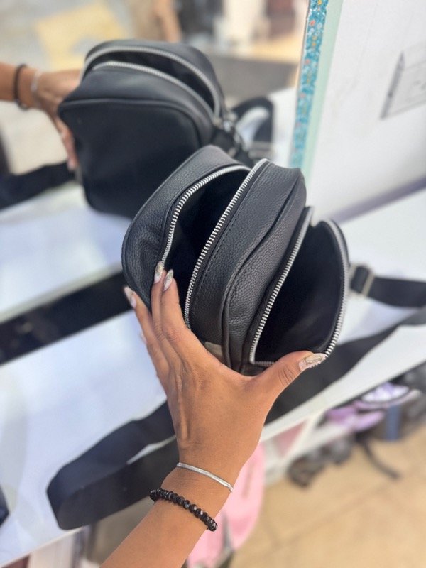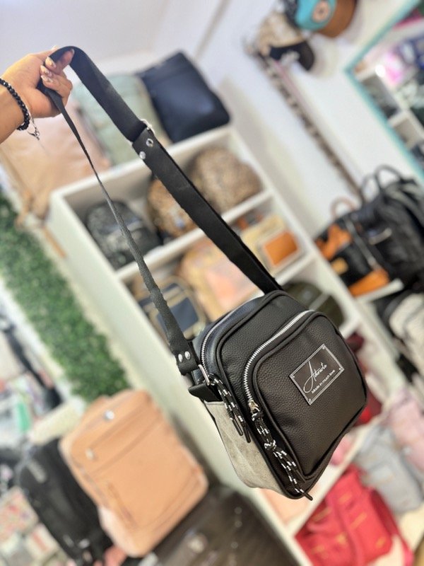 Bandolera confeccionada en símil cuero. Sus medidas de 19 cm de alto, 21 cm de ancho y 8 cm de profundidad la hacen ideal para llevar lo esencial cómodamente.